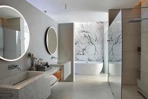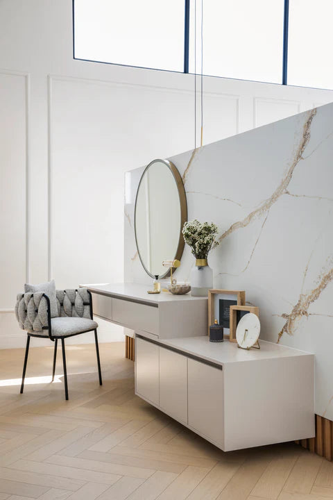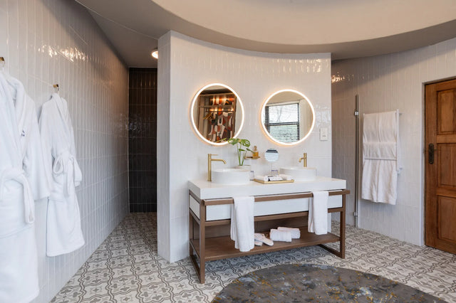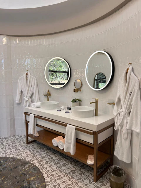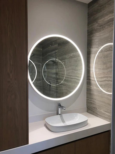 A circular mirror with a continuous illuminated border, wrapped in the seamless Arkivio DeepFrame. Available in all our powdercoat colours and solid precious metals.