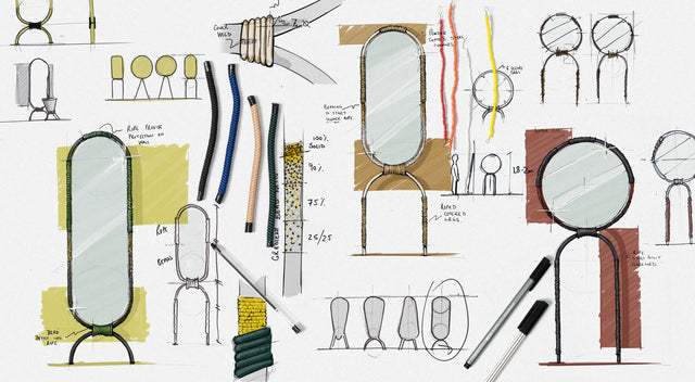 The sculptural frames take elements of African craft and design into a scale fit for a modern living space each with its own unique silhouette. Each frame is hand wrapped with cord, beads and leather intertwined in a dance around the mirror.