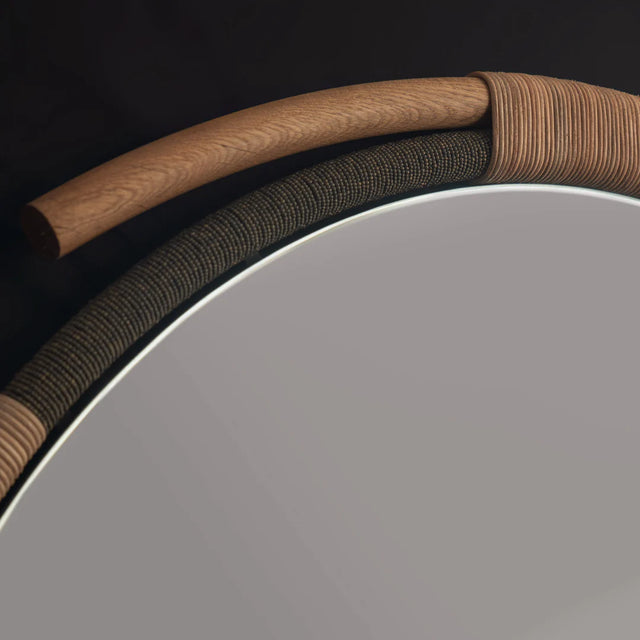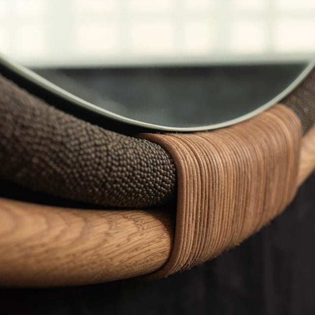 The sculptural frames take elements of African craft and design into a scale fit for a modern living space each with its own unique silhouette. Each frame is hand wrapped with cord, beads and leather intertwined in a dance around the mirror.